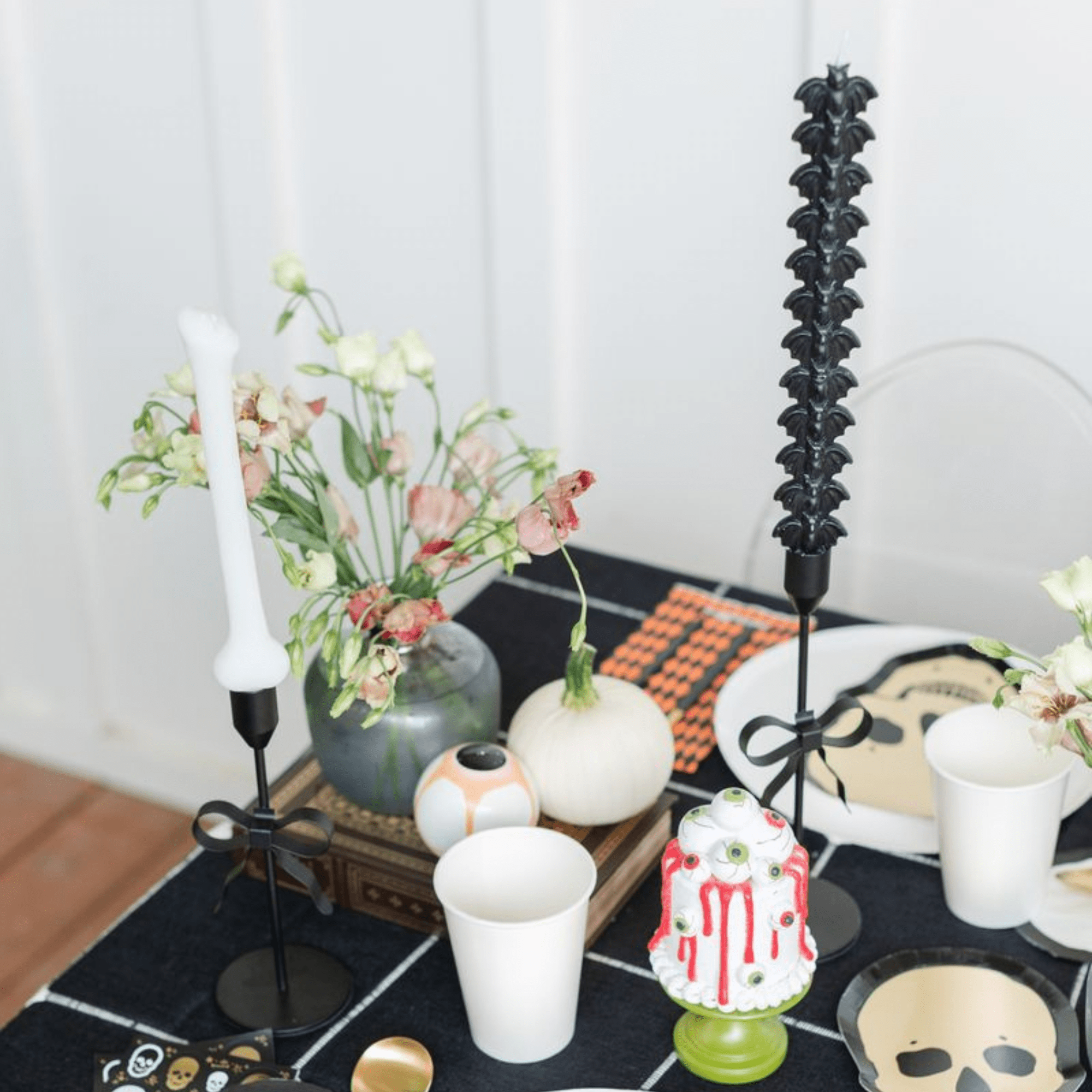Add a dash of drama to your tablescape with these eerie-chic Bat Taper Candles. Featuring fluttering bats, they’re perfect for a spooky soirée or a stylish haunted house.