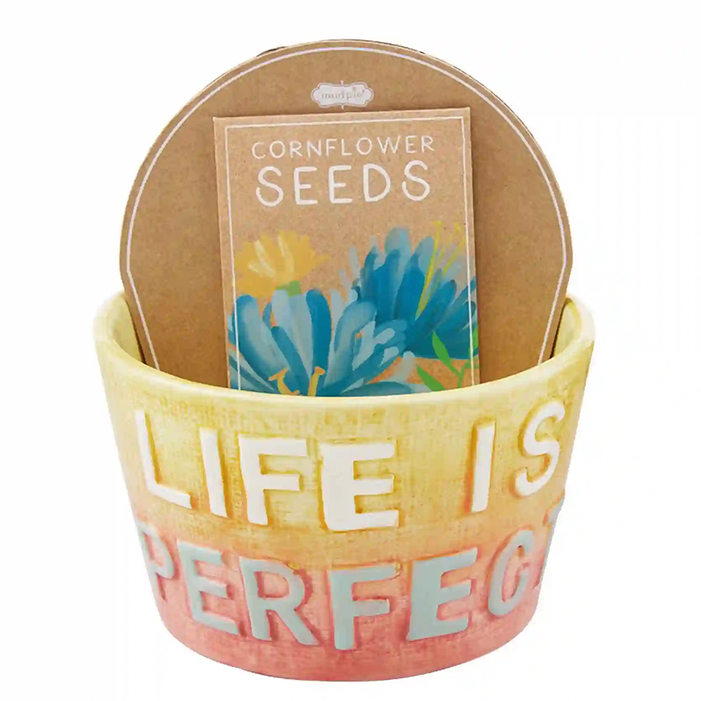 Life is perfect with this Life is Perfect Colorful Planter. The two piece set comes with a hand-painted ceramic pot. The ceramic pot features an ombre design and the sentiment "Life is Perfect". The pot also comes with a Kraft seed packet for growing Cornflower seeds in your new pot!