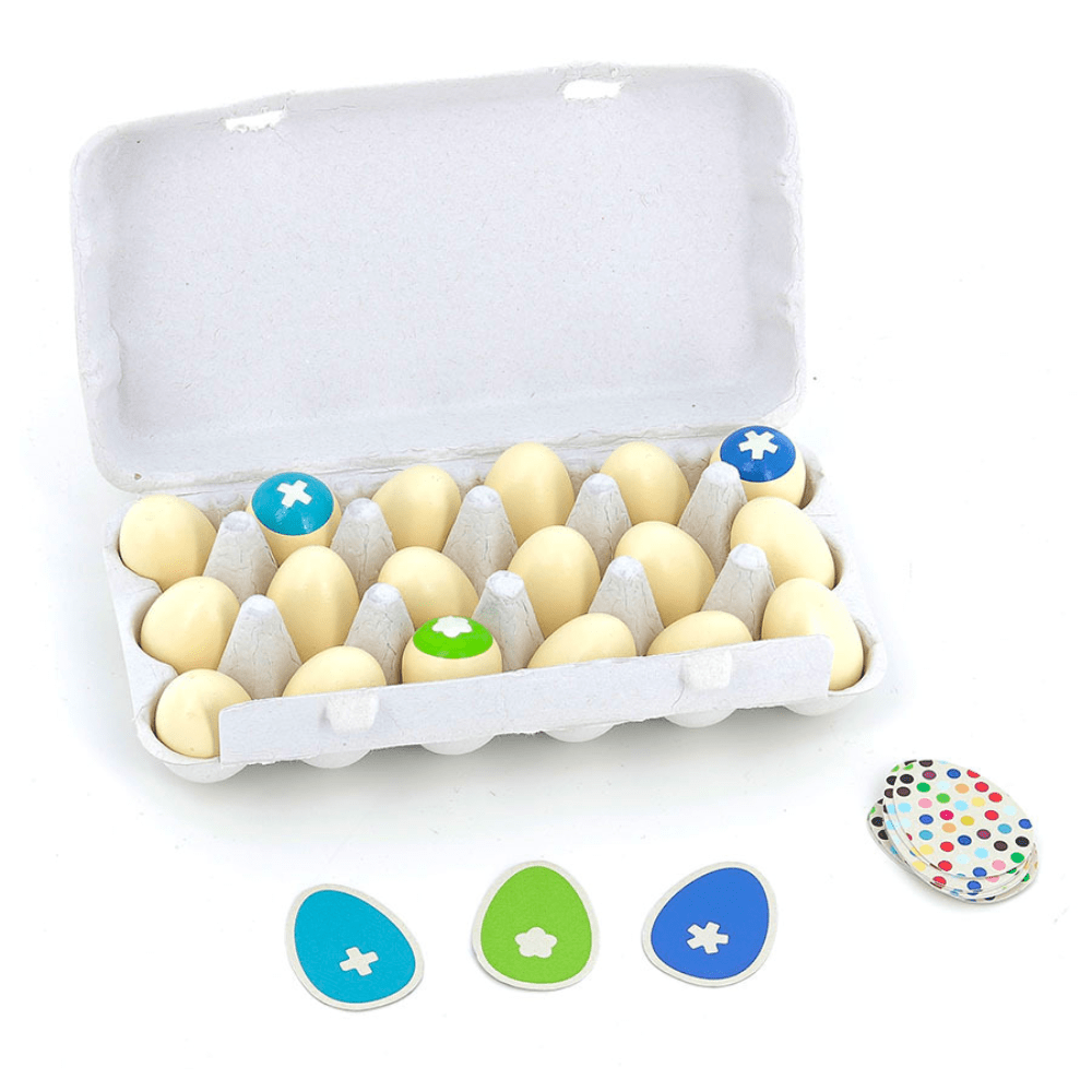 Set includes one box of eggs, 18 small eggs, and 18 egg-shaped cards.