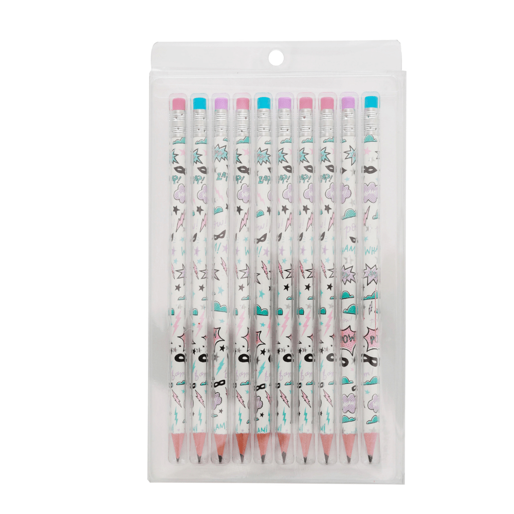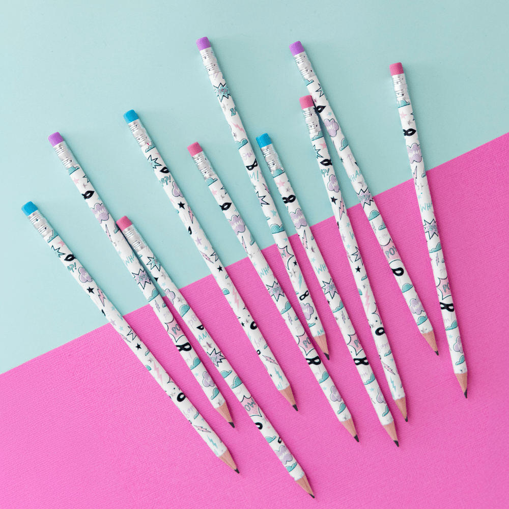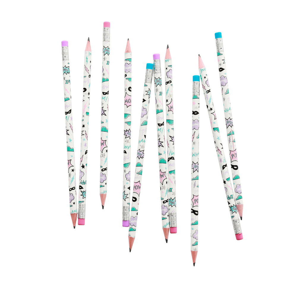 Zap! Bang! Pow! Wham! This pencil set features pastel colors and fun designs. This awesome pencil set is sure to give your little superhero super powers to finish their school work!